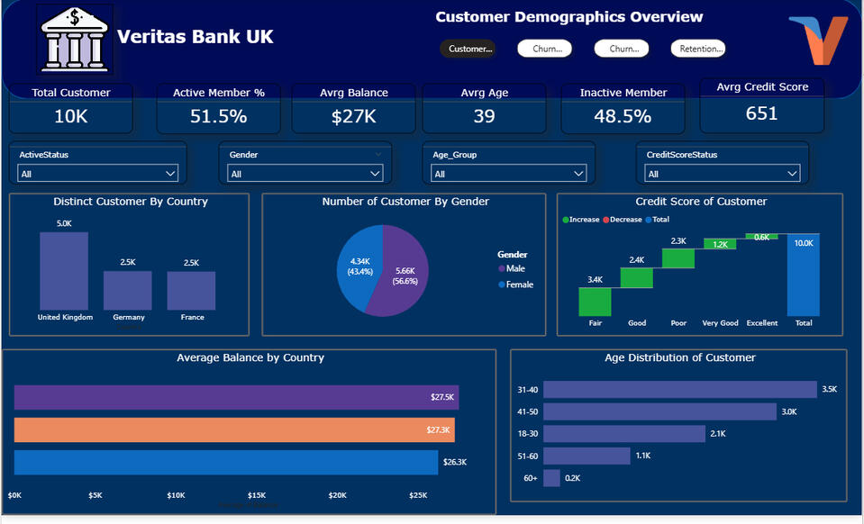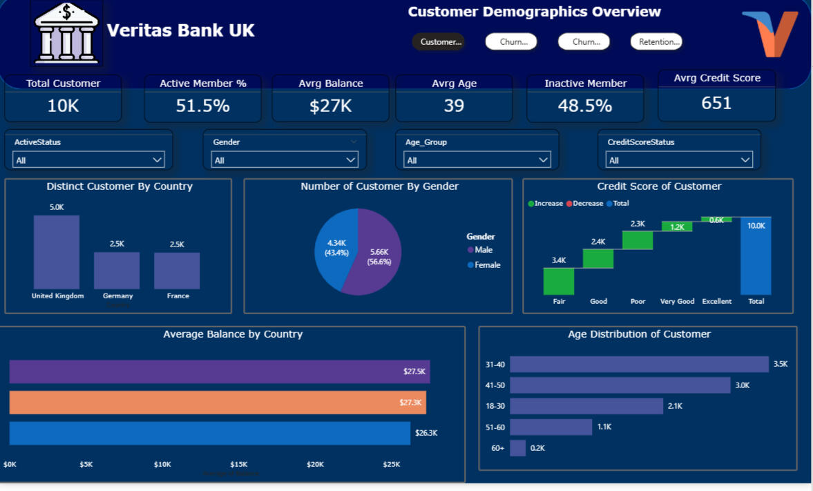 This project analyses customer behavior across multiple regions to identify drivers of churn, segment risk groups, and provide insights to help Veritas Bank improve retention strategies across the UK, Germany, and France.