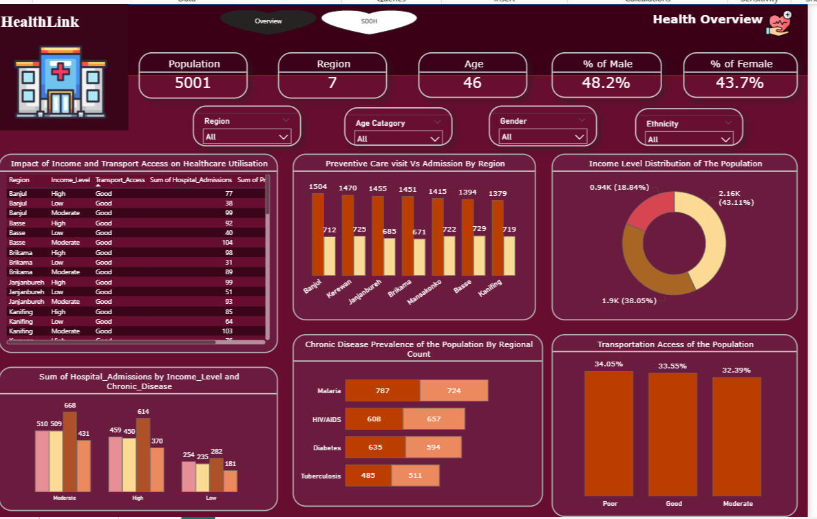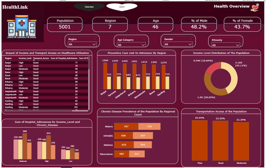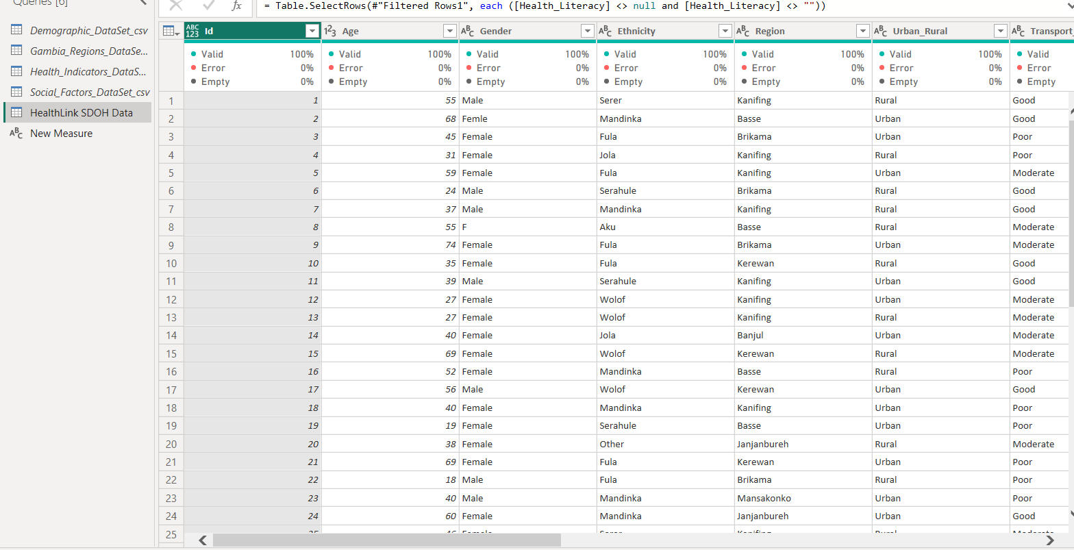 The screenshot below shows the final centralised HealthLink SDOH dataset after integrating multiple raw data sources including demographic, social, and health indicator files, into a single, cleaned table in Power BI (Power Query).During transformation, redundant columns were removed, missing values were handled, and key attributes such as Age, Gender, Ethnicity, Region, Urban/Rural classification, and Transportation access were standardised.This centralised dataset now serves as a unified foundation for analysing Social Determinants of Health (SDOH) across different regions, enabling accurate insights into population health disparities, accessibility, and living conditions.