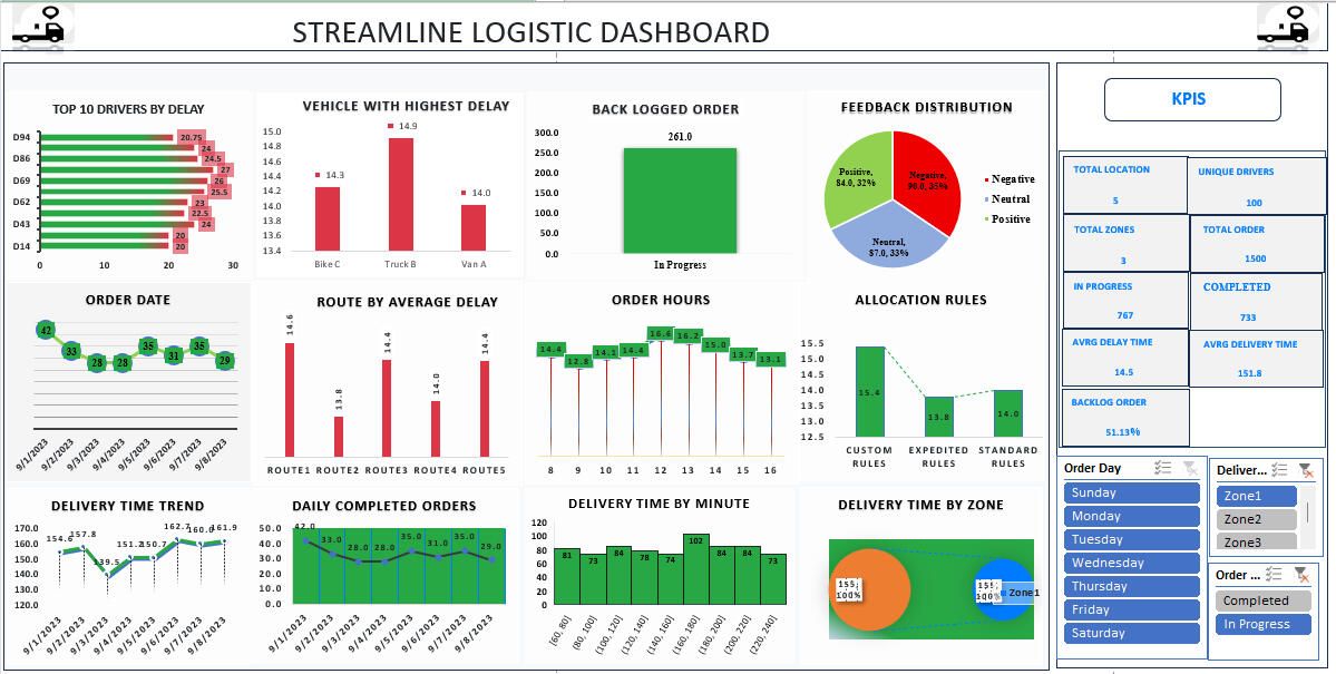 Analysed order fulfillment performance to eliminate backlog issues and improve logistics efficiency, and built an interactive Excel dashboard with automated KPI calculations and Office Scripts to monitor delivery progress and support data-driven operational decisions.