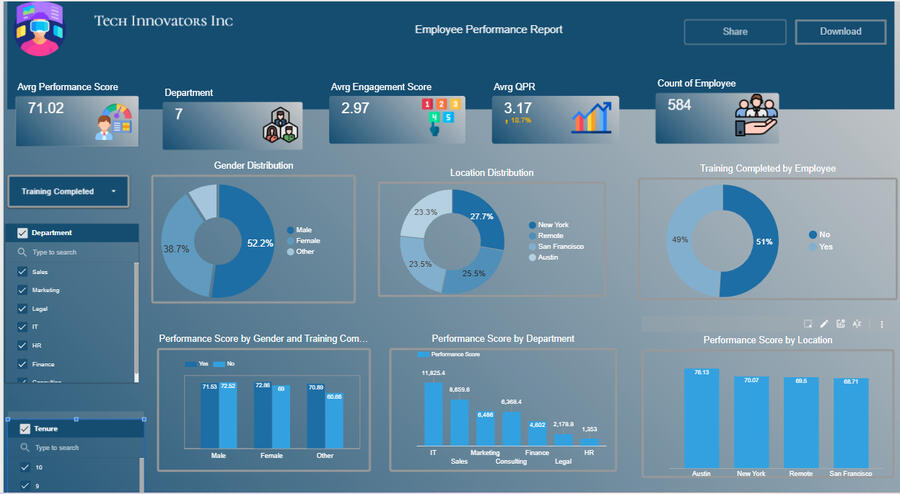 This project analyses employee performance, engagement, and benefit usage to provide HR leadership with real-time visibility and support data-driven decisions that improve development, performance management, and benefit optimisation at Tech Innovators Inc.